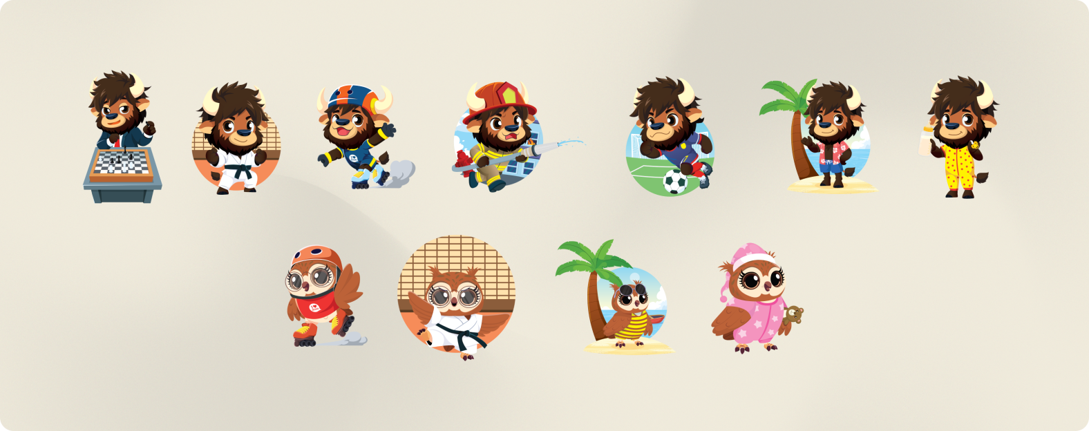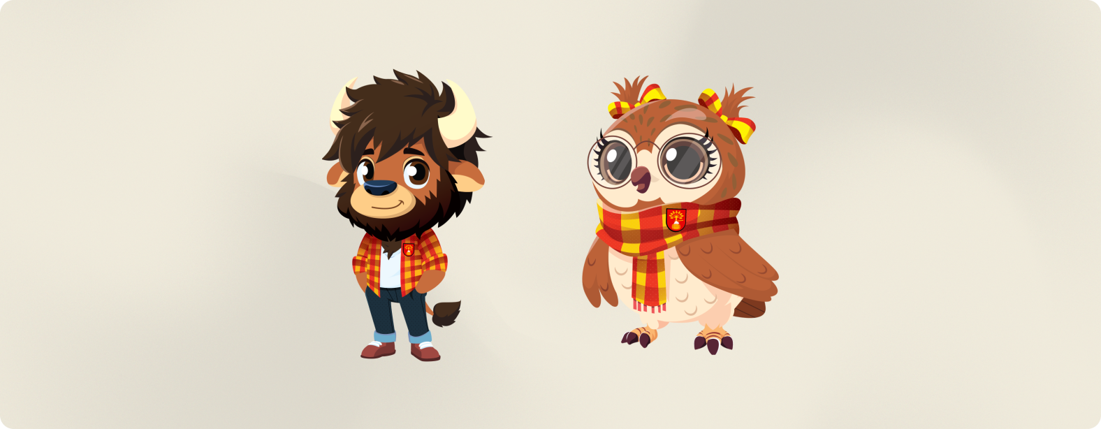 Aby dodatkowo ożywić wizerunek gminy i ułatwić komunikację z mieszkańcami (szczególnie z tymi najmłodszymi), zaprojektowaliśmy dwie postacie brand hero: Sowę i Żubra. Sowa, symbol mądrości, oraz Żubr, związany z lokalną przyrodą, występują w różnych pozach, które podkreślają różnorodne aktywności mieszkańców i walory gminy. Możemy zobaczyć ich, jak jeżdżą na rolkach, grają w piłkę czy ćwiczą karate. Te postacie już stały się ulubieńcami mieszkańców i znalazły swoje miejsce w materiałach promocyjnych, grafice na social mediach i gadżetach.