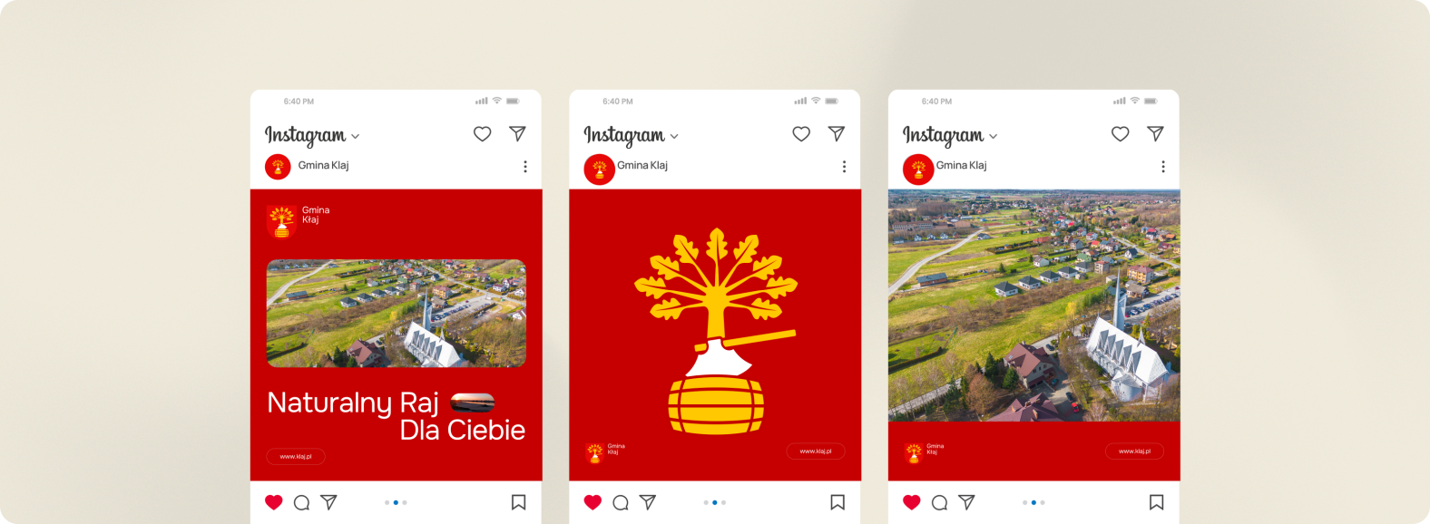 Identyfikacja wizualna Gminy Kłaj została zaprojektowana z myślą o spójności i estetyce, która oddaje wyjątkowy charakter regionu. W ramach projektu stworzyliśmy nowoczesne logo bazujące na herbie gminy, które łączy tradycję z aktualnymi trendami graficznymi. Oprócz tego opracowaliśmy pełny zestaw materiałów promocyjnych, w tym grafikę do mediów społecznościowych, papier firmowy, wizytówki, banery, rollupy, szablony do social media oraz inne elementy wspierające komunikację wizualną. Wszystkie te elementy zostały zaprojektowane w jednolitej stylistyce, co pozwala na skuteczne budowanie wizerunku gminy i lepsze rozpoznanie jej tożsamości przez mieszkańców i turystów.