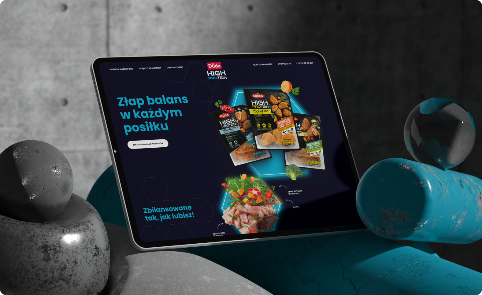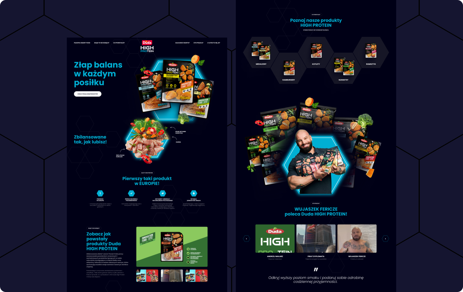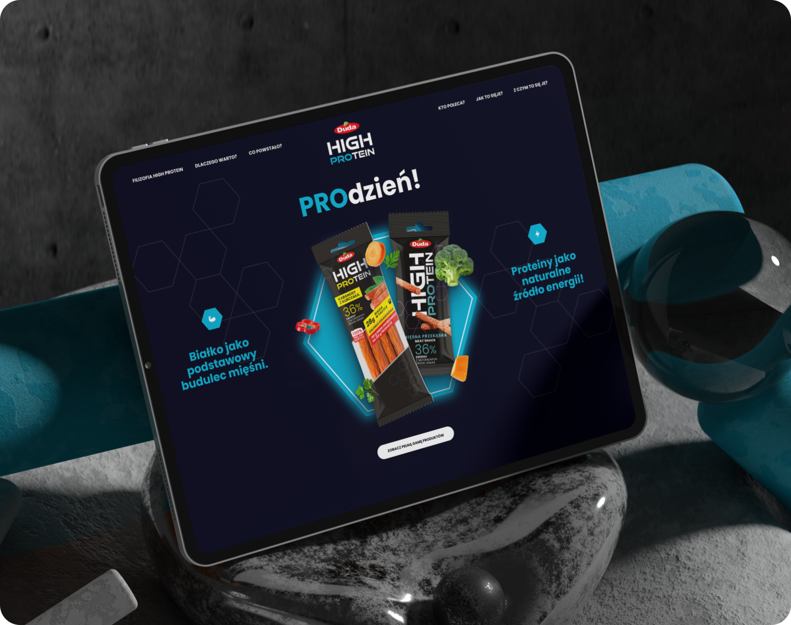 Dla marki DUDA stworzyliśmy serwis internetowy dedykowany nowej linii produktów DUDA HIGH PROTEIN. Strona nawiązuje do identyfikacji wizualnej opakowań i komunikacji marki, tworząc spójne i energetyczne środowisko online, które podkreśla charakter produktów wysokobiałkowych.