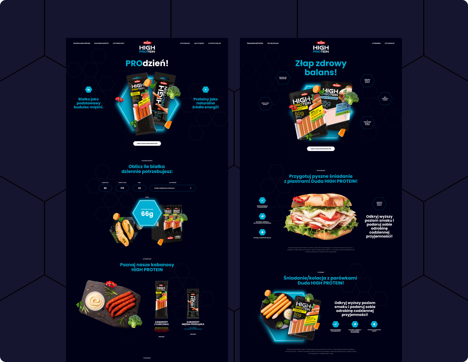 Całość projektu została dopasowana do wyglądu opakowań i języka wizualnego marki DUDA HIGH PROTEIN. Strona odzwierciedla energię, sportowy charakter i nowoczesny styl życia, które stoją za linią produktów wysokobiałkowych.