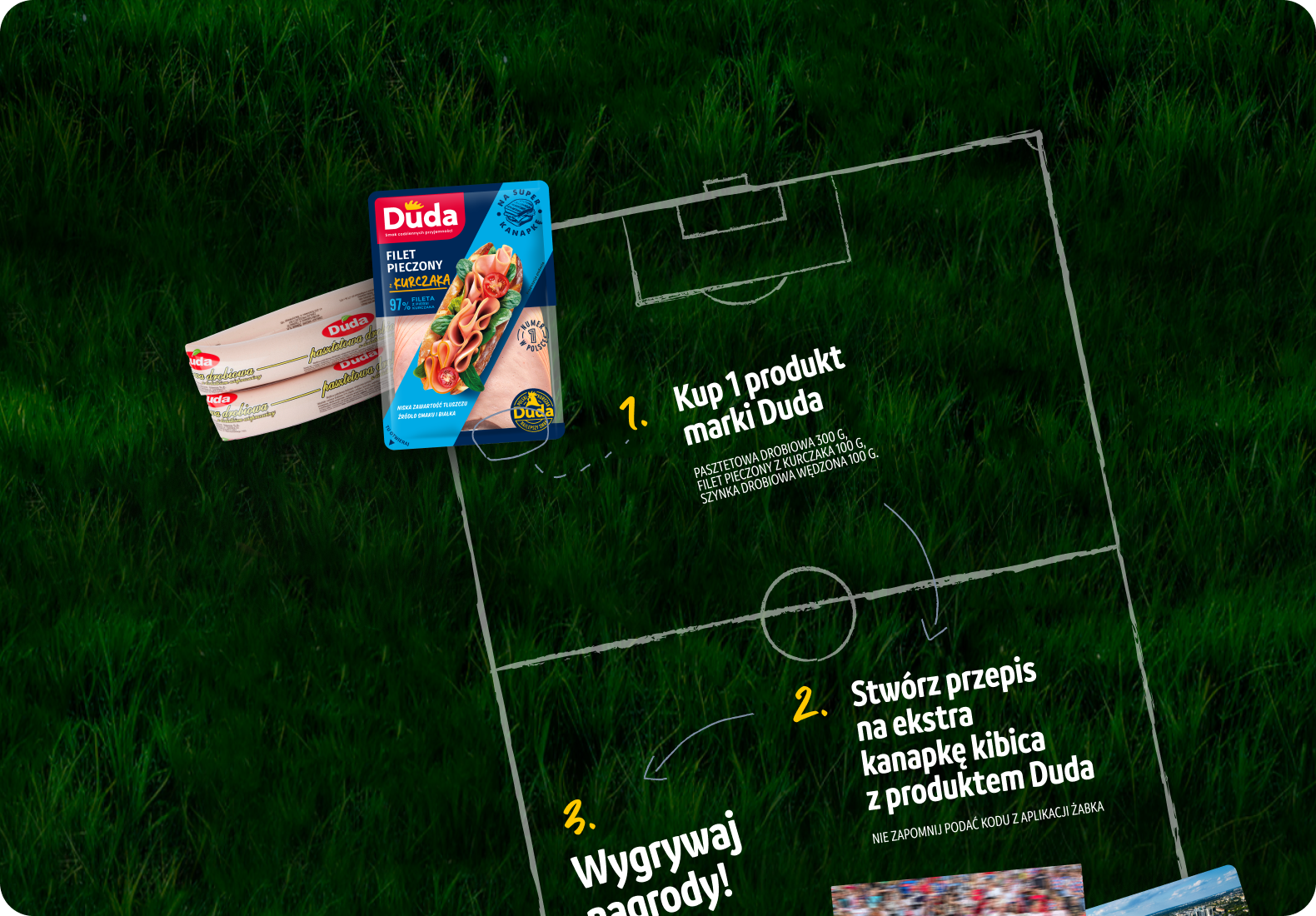 Zadanie konkursowe angażowało uczestników kreatywnie: „Stwórz przepis na ekstra kanapkę kibica z produktem DUDA”. Mechanizm był prosty, ale skuteczny – połączenie produktu, emocji sportowych i realnej nagrody premium budowało zaangażowanie i zwiększało sprzedaż produktów DUDA w sklepach Żabka.
