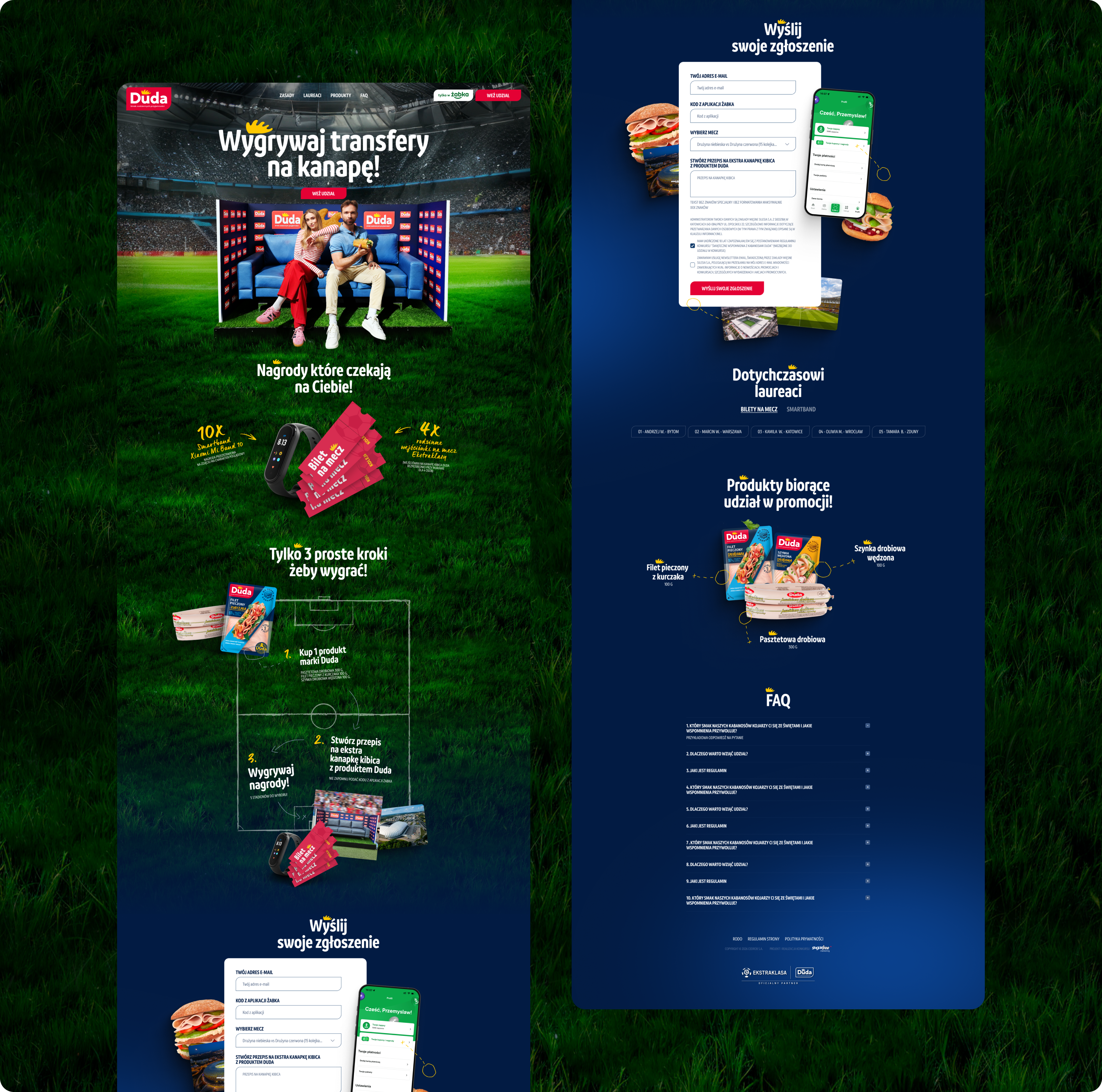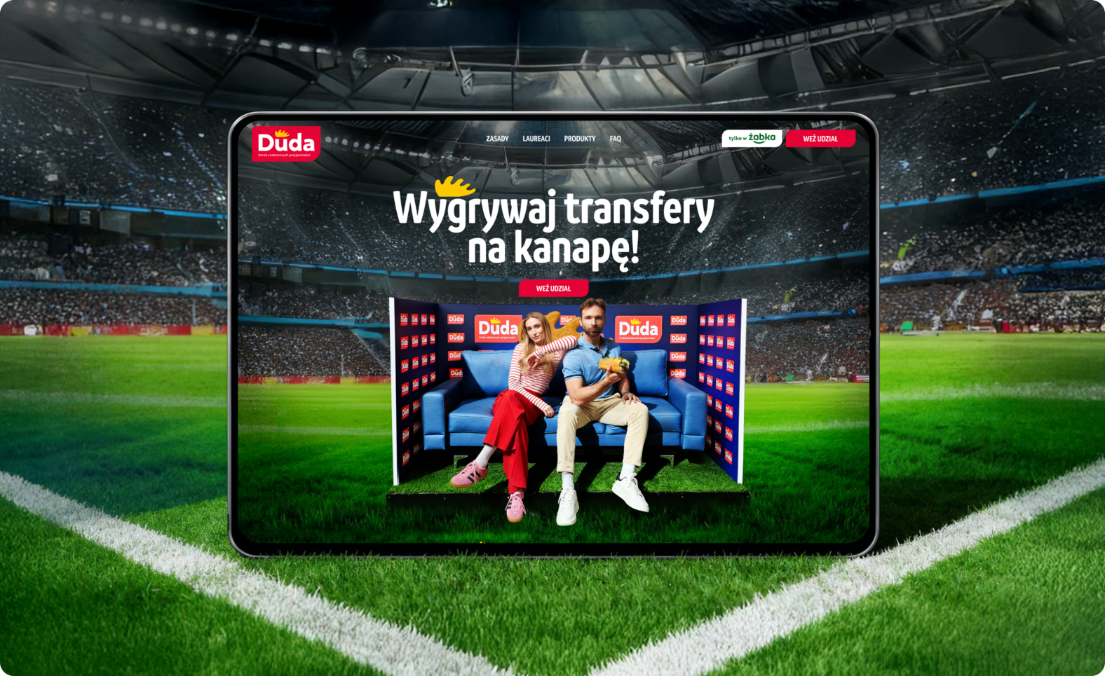 Dla marki DUDA zrealizowaliśmy landing page oraz kompleksową obsługę konkursu „Wygrywaj transfery na kanapę!” – akcji powiązanej z partnerstwem marki z Ekstraklasa. Przy murawie wybranych meczów stanęła specjalna kanapa DUDA, a uczestnicy konkursu mogli wygrać rodzinne bilety właśnie na nią.