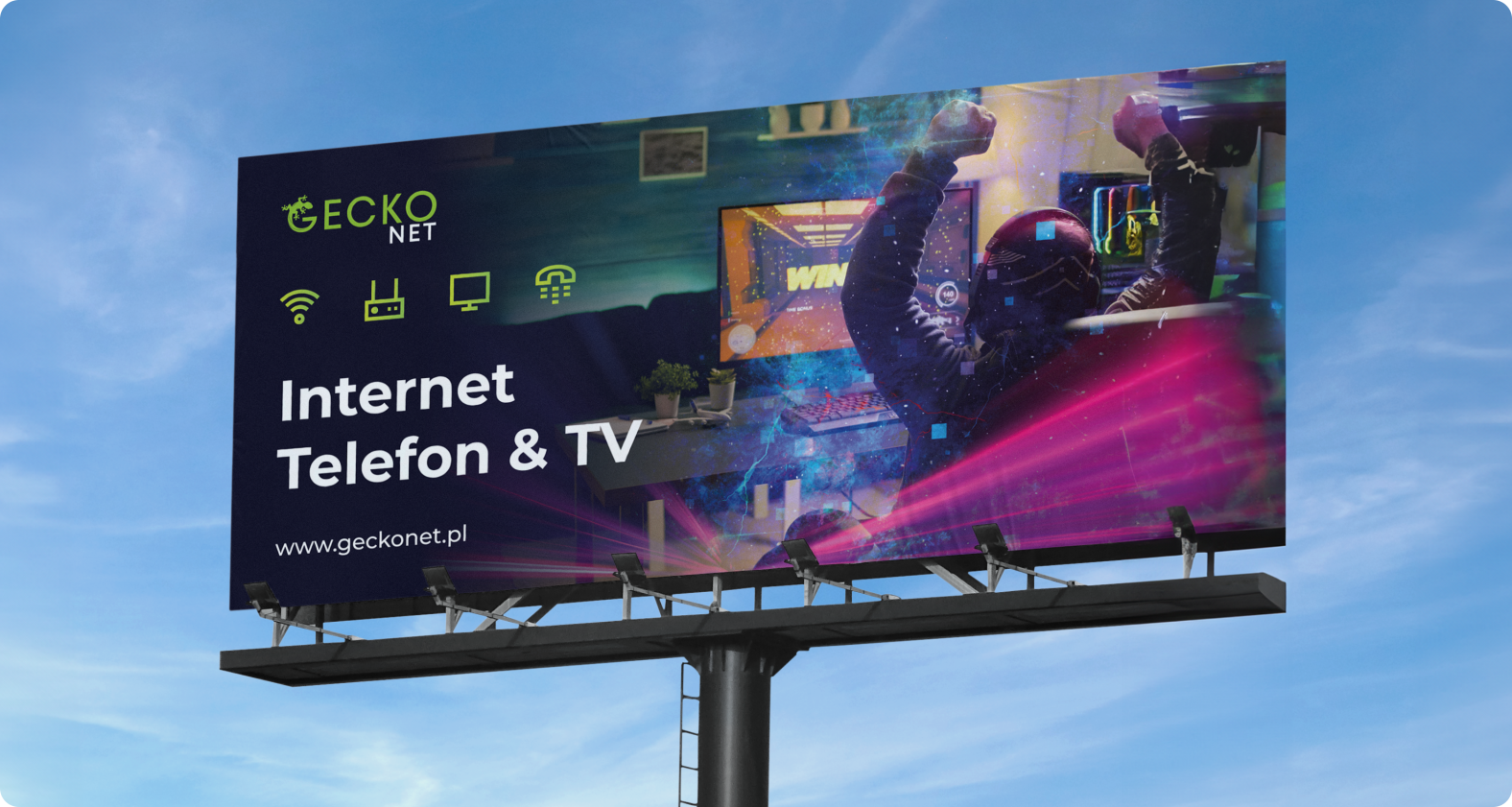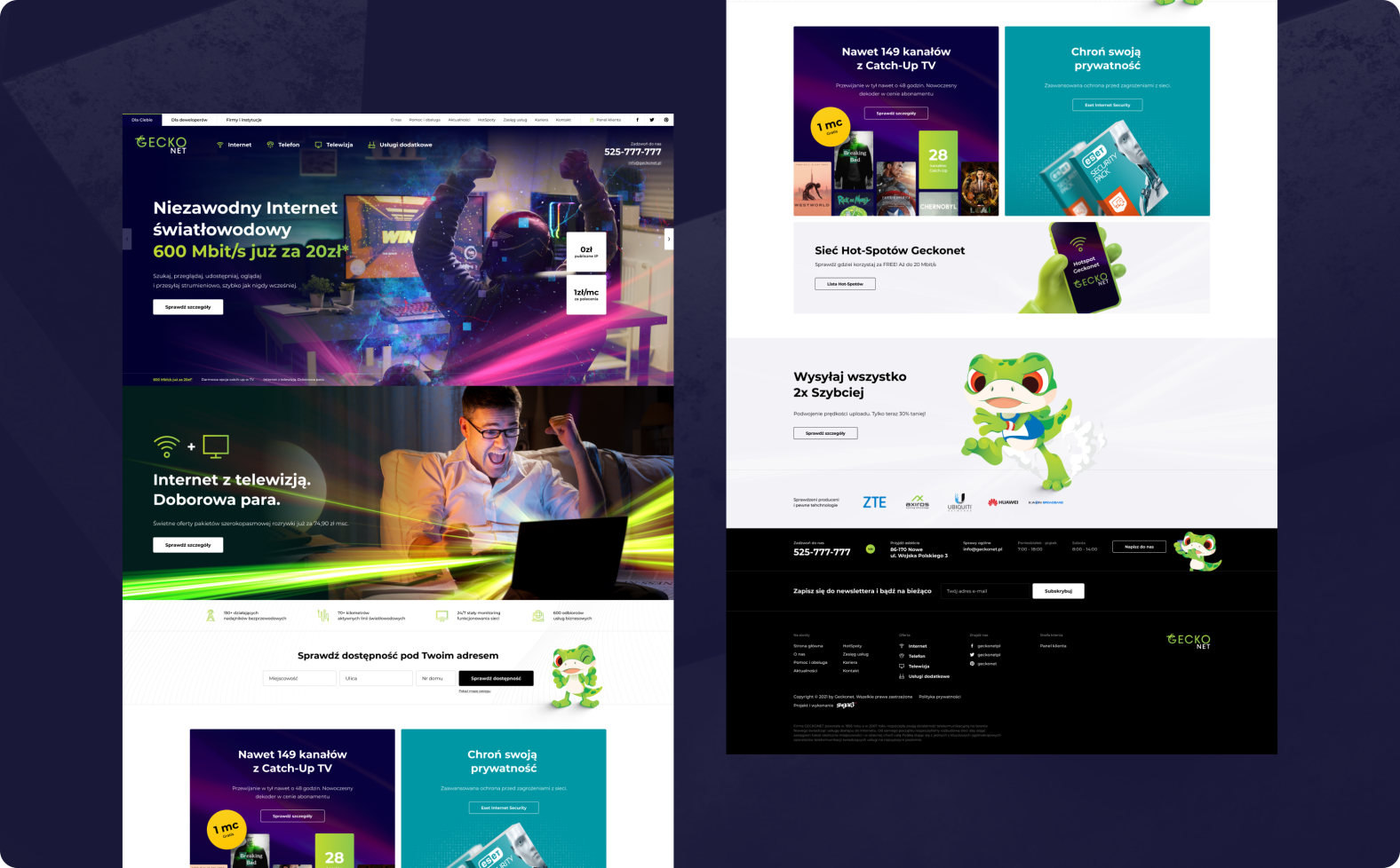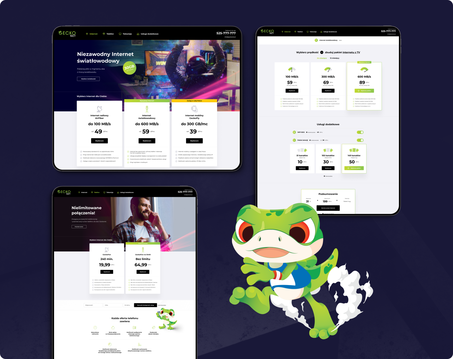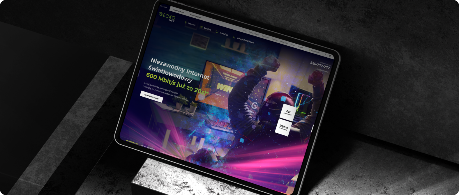 Dla Geckonet – dostawcy internetu światłowodowego, radiowego, telefonii i telewizji – przygotowaliśmy pełną realizację obejmującą stronę internetową, brand hero oraz szeroki zakres identyfikacji wizualnej. Firma oferuje swoje usługi zarówno klientom indywidualnym, jak i biznesowym oraz deweloperom, dlatego zaprojektowany serwis posiada dedykowane wersje oferty dla każdej z tych grup.