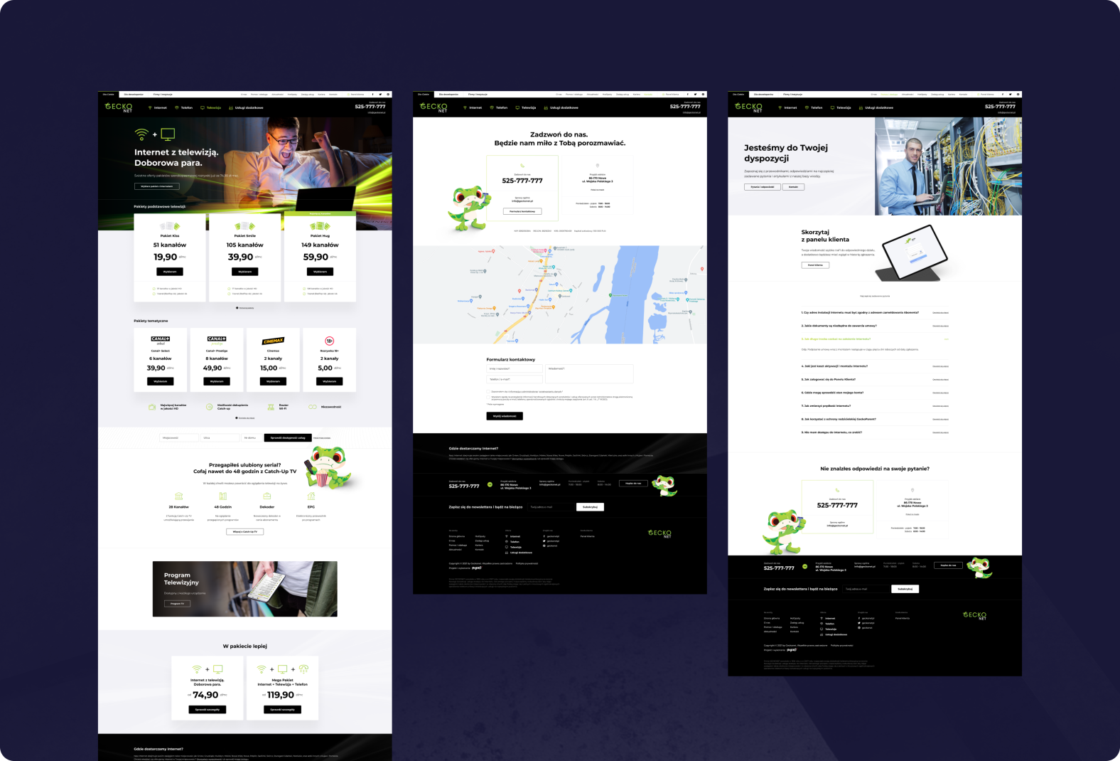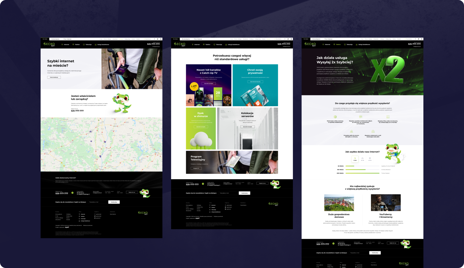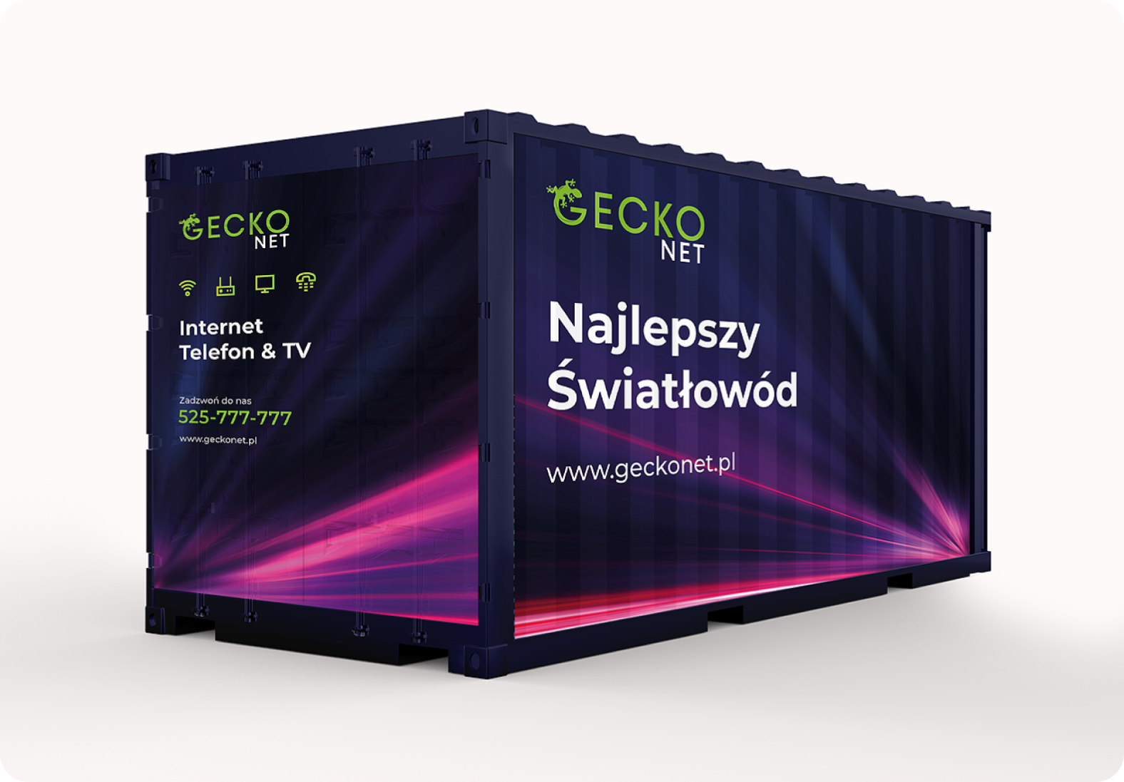 Dla Geckonet – dostawcy internetu światłowodowego, radiowego, telefonii i telewizji – przygotowaliśmy pełną realizację obejmującą stronę internetową, brand hero oraz szeroki zakres identyfikacji wizualnej. Firma oferuje swoje usługi zarówno klientom indywidualnym, jak i biznesowym oraz deweloperom, dlatego zaprojektowany serwis posiada dedykowane wersje oferty dla każdej z tych grup.
