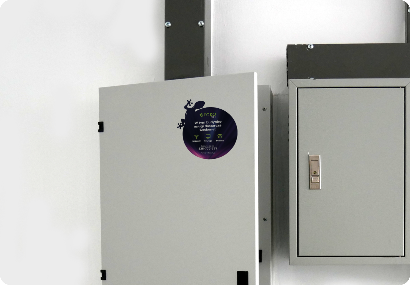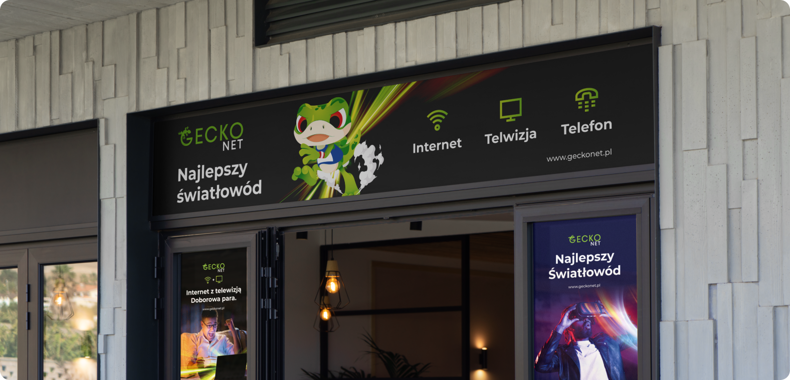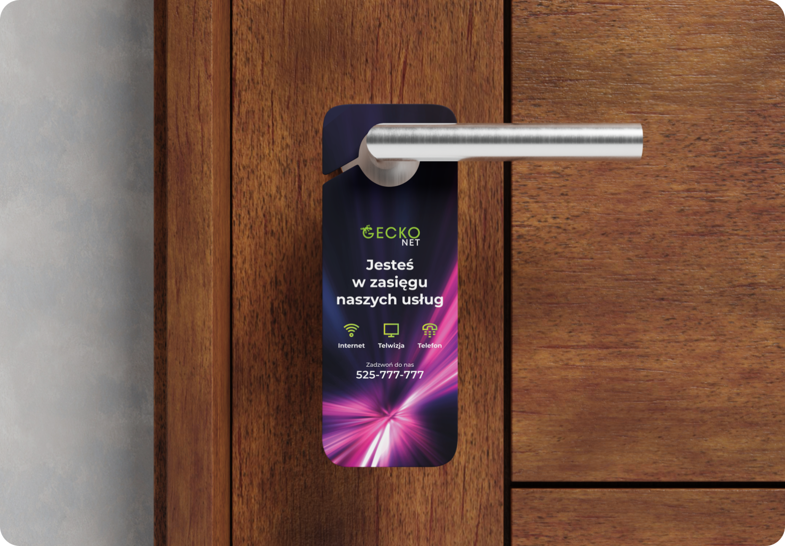 Przygotowaliśmy zestaw materiałów wspierających rozpoznawalność marki – banery, zawieszki na drzwi, naklejki na skrzynki oraz inne elementy, które w spójny sposób komunikują nową identyfikację Geckonet.
