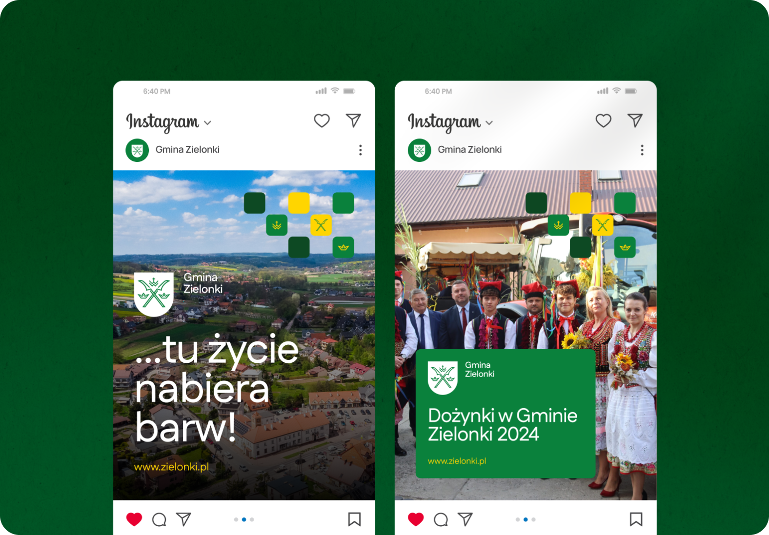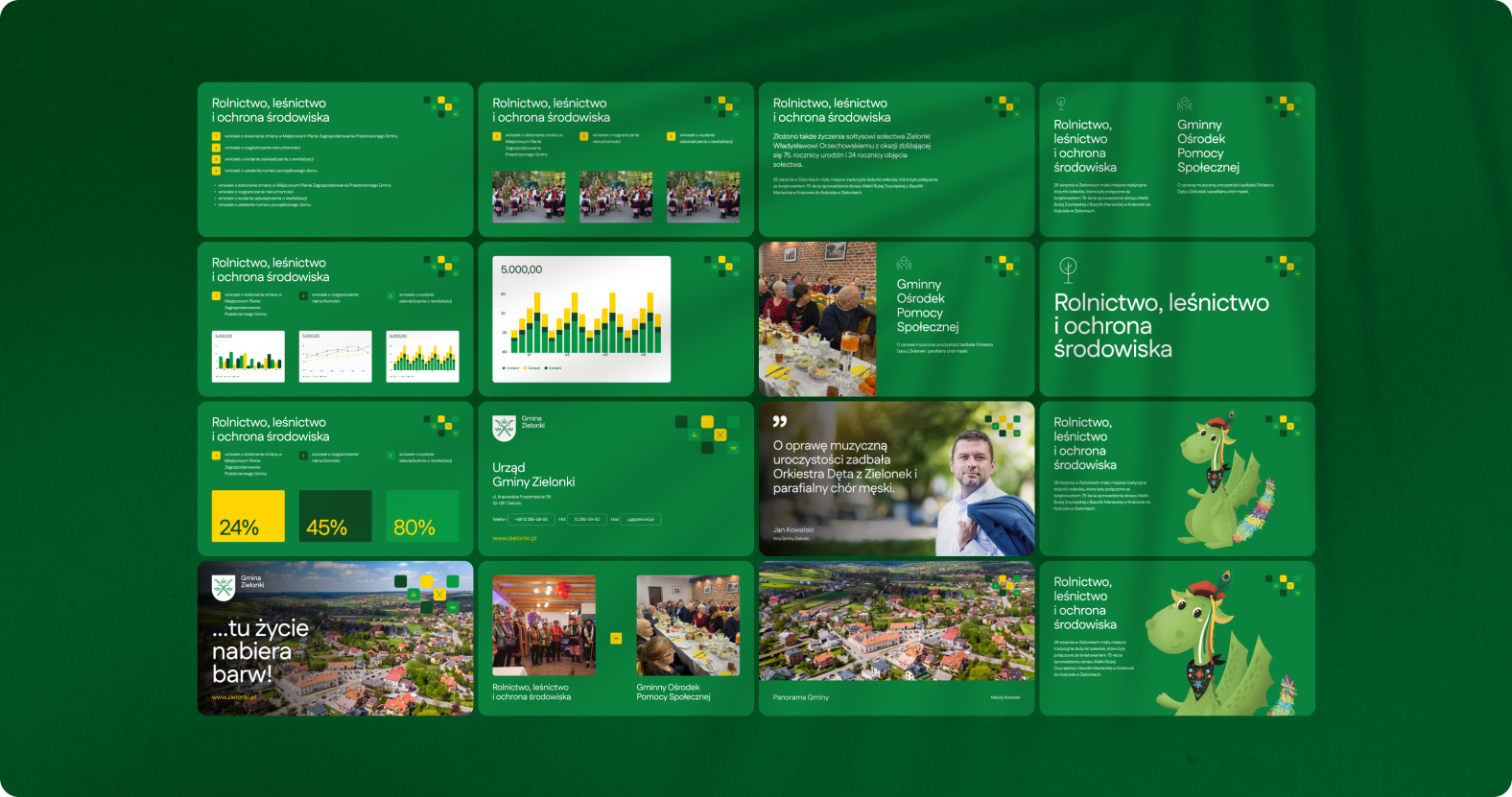 Opracowana identyfikacja wizualna została przeniesiona również na materiały do mediów społecznościowych oraz szablonu prezentacji. Dzięki temu gmina zyskała spójne grafiki i szablony, które ułatwiają codzienną komunikację online i podkreślają nowoczesny charakter instytucji.