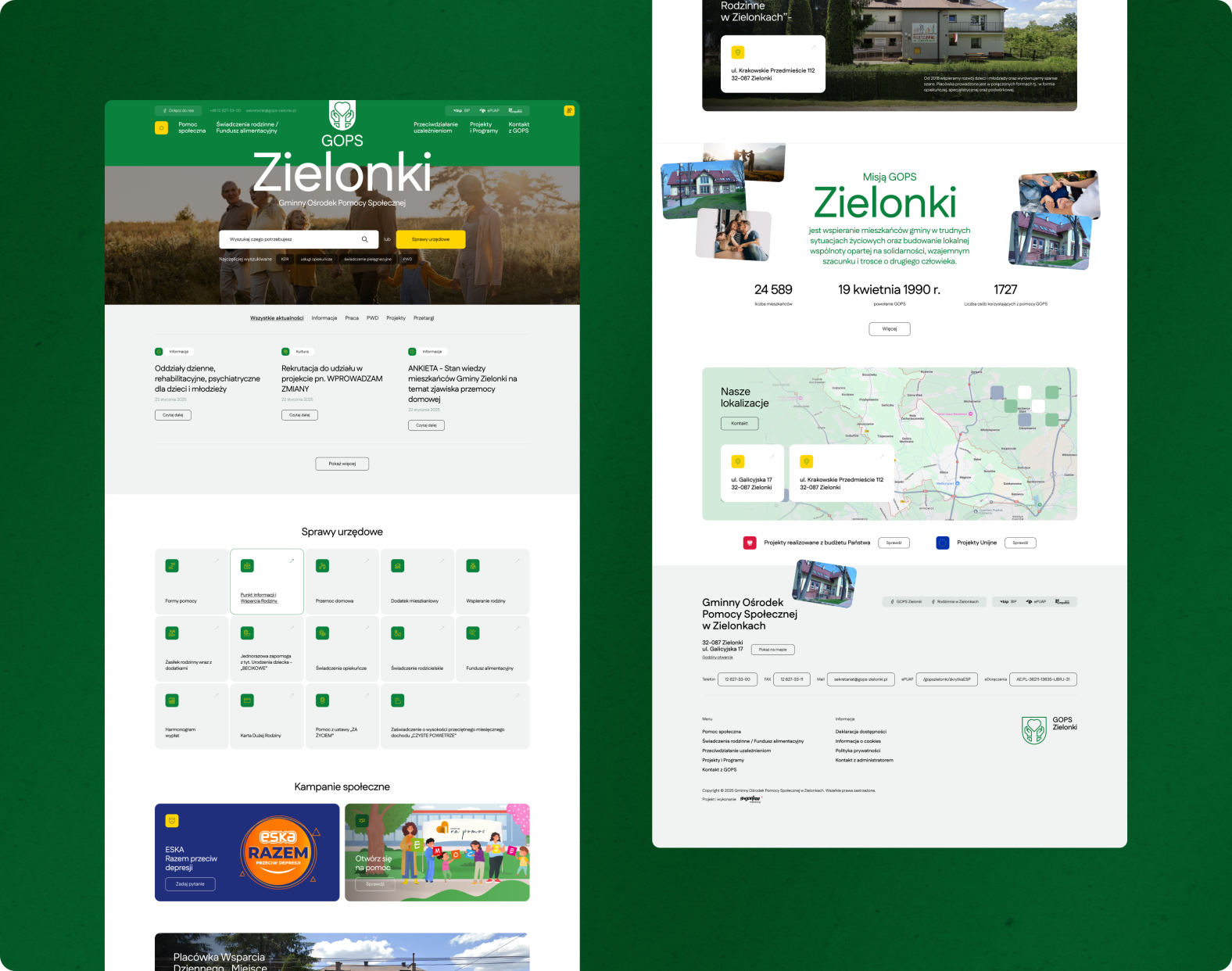 Dla Gminnego Ośrodka Pomocy Społecznej w Zielonkach przygotowaliśmy również logo, identyfikację wizualną oraz stronę internetową, utrzymane w stylistyce opracowanej dla Gminy Zielonki. Dzięki temu komunikacja obu instytucji jest jednolita i profesjonalna.