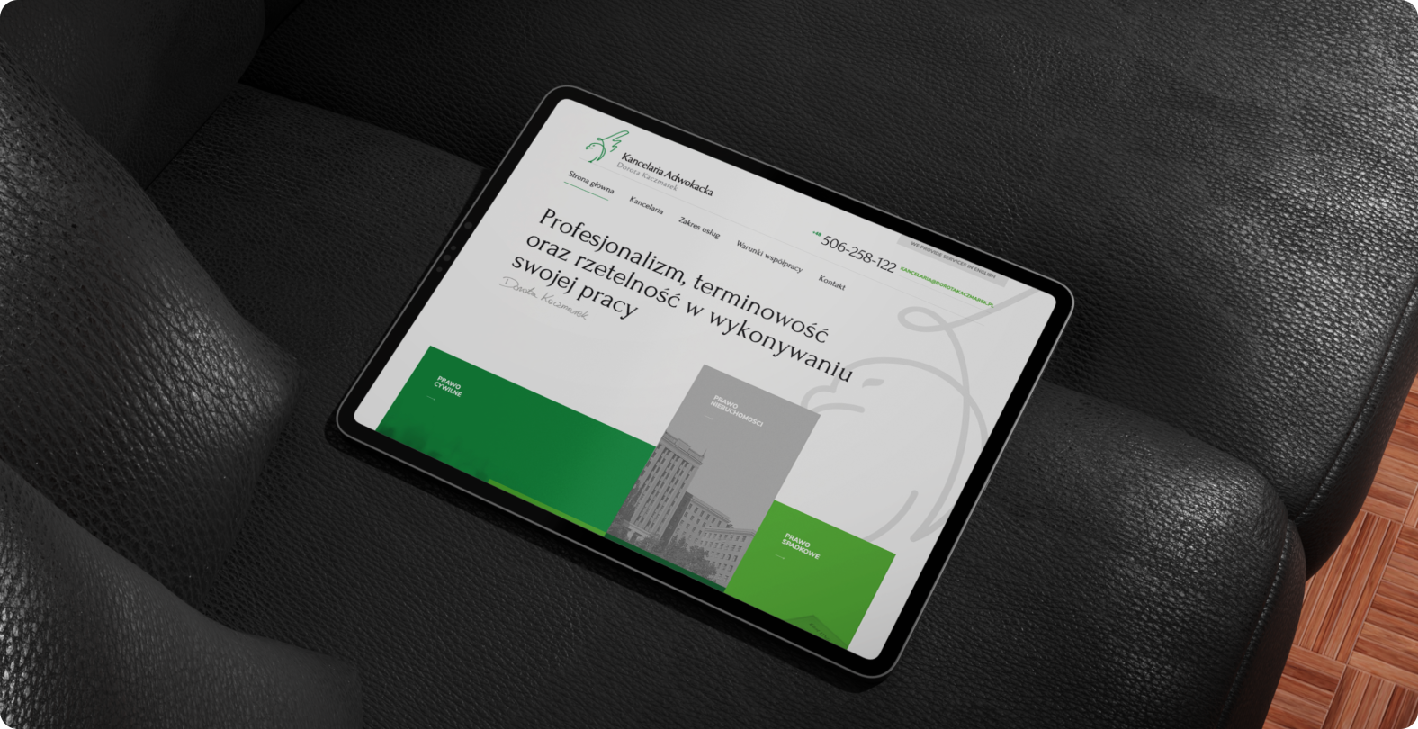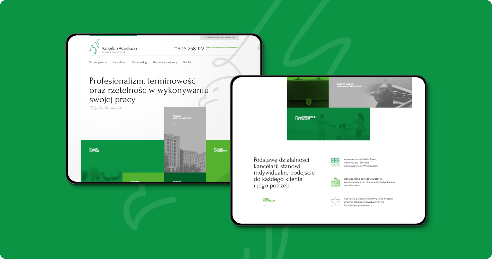 Dla adwokat Doroty Kaczmarek stworzyliśmy kompletną realizację obejmującą stronę internetową, logo oraz podstawowe elementy identyfikacji wizualnej. Projekt miał podkreślać profesjonalizm kancelarii, a jednocześnie być przejrzysty i przyjazny dla użytkownika.