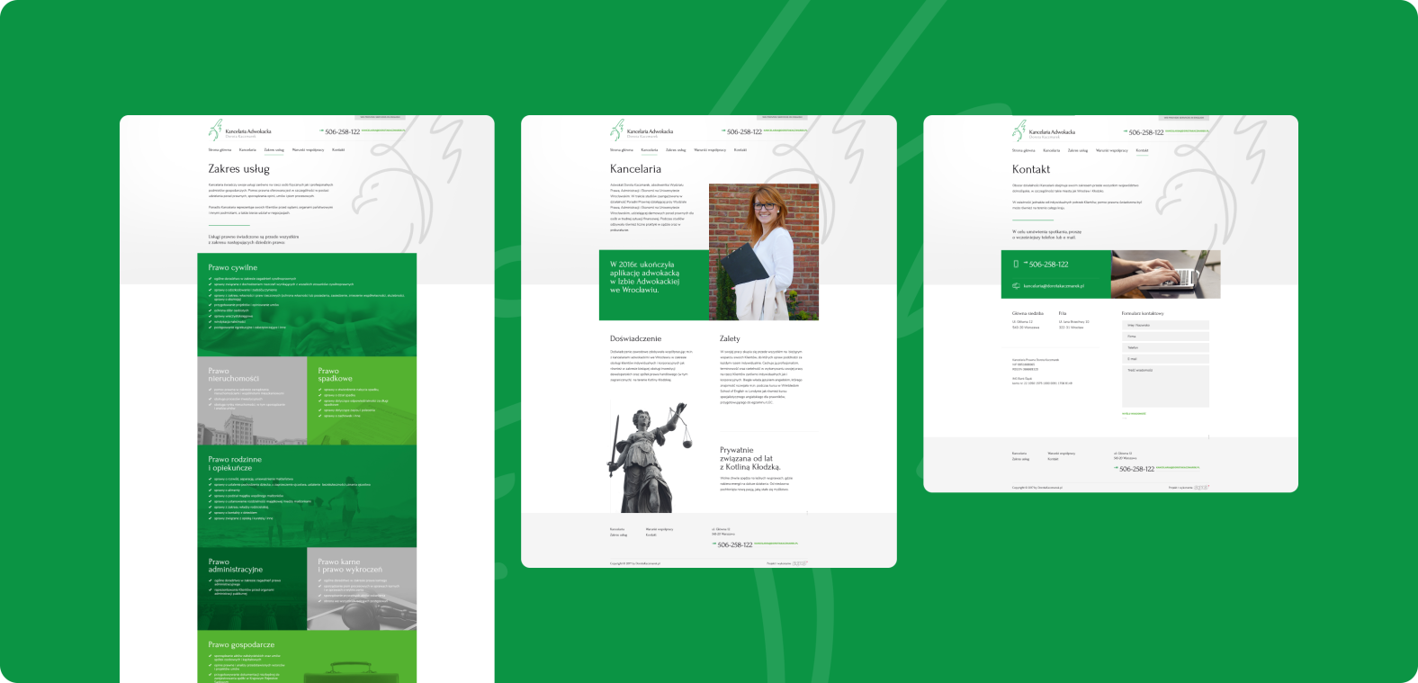 Strona prezentuje ofertę kancelarii, informacje o adwokacie oraz dane kontaktowe w klarownej i intuicyjnej formie. Dzięki dopracowanej strukturze i estetyce projekt wspiera profesjonalny odbiór kancelarii w internecie.