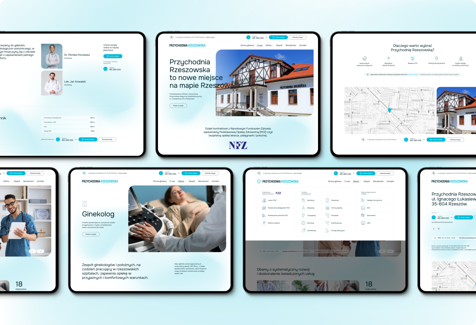 Dla Przychodni Rzeszowskiej przygotowaliśmy pełną realizację obejmującą stronę internetową, logo oraz identyfikację wizualną. Projekt miał podkreślać profesjonalizm i szeroki zakres usług medycznych, a jednocześnie być przyjazny i czytelny dla pacjentów.